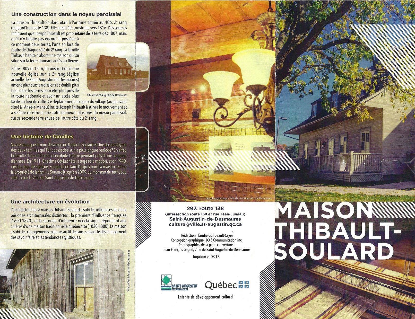«La maison Thibault-Soulard présente un intérêt patrimonial pour sa valeur historique. Cette résidence rappelle la présence de familles Thibault et Soulard à Saint-Augustin-de-Desmaures pendant plusieurs générations. La seigneurie de Maur est octroyée à Jean Juchereau de Maur en 1647 mais la concession des terres s’amorce lentement. Les Thibault sont parmi les premières familles à s’établir dans la seigneurie. La paroisse est érigée canoniquement en 1691 et les premiers édifices paroissiaux sont alors bâtis, dont une chapelle en bordure du fleuve. Le lieu de culte est par la suite déplacé à l’Anse-à-Maheu avant que ne soit construite la première église entre 1720 et 1723. En 1807, Joseph Thibault possède une terre dans le Premier Rang sur laquelle se trouve une résidence en mauvais état. Il est également propriétaire d’une autre terre localisée dans le Deuxième Rang où il n’y a pas de construction. Il fait probablement ériger la demeure aujourd’hui connue sous le nom de maison Thibault-Soulard vers 1816 au moment où est complété le chemin du Deuxième Rang sur toute sa longueur. Le lieu est plus facile d’accès que l’autre terre et plus près de la seconde église érigée entre 1809 et 1816 sur le plateau du Deuxième Rang. La famille Thibault occupe la maison et y exploite la terre pendant près d’une centaine d’années avant de la vendre en 1911. La famille Soulard acquiert la résidence en 1940 et demeure propriétaire pendant près de 70 ans. Saint-Augustin-de-Desmaures reste une localité essentiellement agricole jusqu’au courant des années 1970. De nouveaux résidants travaillant à l’extérieur de la ville viennent alors s’y établir. La maison Thibault-Soulard témoigne ainsi de la vocation agricole qui a marqué le territoire de Saint-Augustin-de-Desmaures.